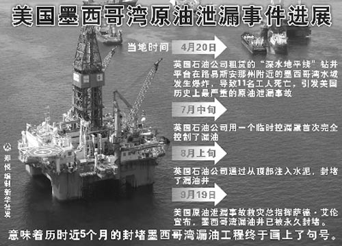美國(guó)墨西哥灣原油泄漏事件救災(zāi)總指揮艾倫9月19日宣布,美國(guó)內(nèi)政部海洋能源管理局已經(jīng)確認(rèn),17日起從一口新鉆出的減壓井灌入漏油井底部的水泥已經(jīng)凝固并通過(guò)了壓力測(cè)試。“現(xiàn)在我們終于可以說(shuō),發(fā)生泄漏的MC252油井已被有效封死,今后不會(huì)再對(duì)墨西哥灣造成任何危害。”美國(guó)救災(zāi)現(xiàn)場(chǎng)指揮、海岸警衛(wèi)隊(duì)少將保羅·楚孔夫特表示,盡管漏油井已被封死,但清理墨西哥灣泄漏原油的工作遠(yuǎn)未結(jié)束。肇事的英國(guó)石油公司19日發(fā)布一份新聞公報(bào)說(shuō),該公司為應(yīng)對(duì)墨西哥灣漏油事故已支出約95億美元。這一數(shù)字包括應(yīng)對(duì)泄漏的費(fèi)用、減壓井鉆探費(fèi)用、靜滅法費(fèi)用、對(duì)墨西哥灣沿海各地的補(bǔ)貼和賠償金等。