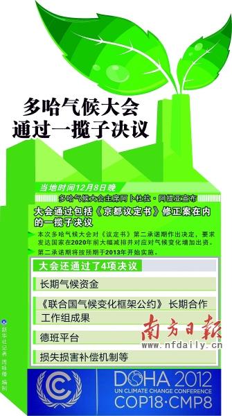 經(jīng)過(guò)一天一夜的“加時(shí)”鏖戰(zhàn),多哈氣候大會(huì)終于在當(dāng)?shù)貢r(shí)間8日晚上通過(guò)一攬子決議,戲劇般地落下帷幕。會(huì)議決定從2013年開(kāi)啟《京都議定書(shū)》第二承諾期,為期8年。此外,會(huì)議還決定到2015年時(shí)達(dá)成一個(gè)涉及所有國(guó)家的有關(guān)2020年后全球應(yīng)對(duì)氣候變化行動(dòng)的協(xié)議,并重申發(fā)達(dá)國(guó)家應(yīng)當(dāng)為發(fā)展中國(guó)家應(yīng)對(duì)氣候變化提供資金支持。