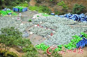 近日,有熱心讀者致電廣州日報(bào)稱一個地下金屬回收廠藏身于布吉南灣一處山坳里,留意觀察才發(fā)現(xiàn)里面的人用明火和強(qiáng)酸提煉各種金屬,近百桶裝滿各種腐蝕性、強(qiáng)酸性的化學(xué)品就堆放在一個雨棚下面,對周邊環(huán)境危害很大。1月25日上午,記者驅(qū)車從吉廈工業(yè)園內(nèi)經(jīng)過一段崎嶇不平的山路,才在一處山坳里找到這處極其隱蔽的地下金屬回收廠。