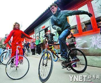 只能通過(guò)一輛小轎車的五道營(yíng)胡同,幾十名“老外”耍起車技,昨天(7日)下午,來(lái)自美國(guó)、德國(guó)、英國(guó)、法國(guó)等十六個(gè)國(guó)家的五十余名外國(guó)朋友用自行車表演,與“胡同鄰居”共同倡導(dǎo)“綠色出行、低碳生活”主題。
