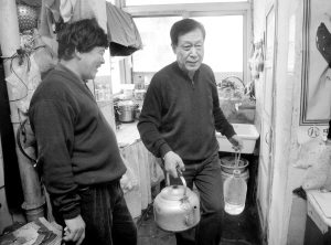 記者看到,居民常先生左手拎著塑料桶、右手提著鐵皮壺,緩慢地沿外樓梯上樓!绊敇嵌紱]水三個月了,我們過了個干巴巴的年!彼f,“自來水公司承諾年前來水,可沒兌現(xiàn),到現(xiàn)在還是這樣!