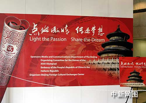 當(dāng)?shù)貢r(shí)間3月29日,“點(diǎn)燃激情、傳遞夢(mèng)想”北京奧運(yùn)會(huì)火炬?zhèn)鬟f主題圖片展覽,在希臘奧委會(huì)辦公樓一層大廳舉辦。 中新社記者 王歡