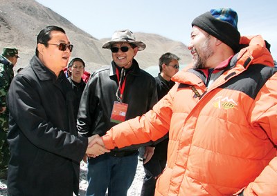 3月30日,在日喀則檢查指導(dǎo)維護(hù)穩(wěn)定和邊境管理工作的自治區(qū)黨委副書記、自治區(qū)常務(wù)副主席郝鵬,公安部副部長(zhǎng)張新楓,帶領(lǐng)工作組一行專程前往珠峰大本營(yíng),檢查北京奧運(yùn)會(huì)火炬登頂珠峰的安全保障工作情況。
