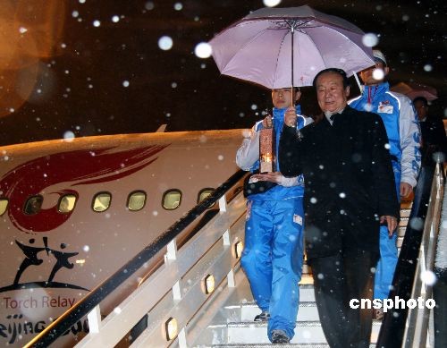 巴黎時間六日晚十一時四十五分(北京時間七日凌晨五時四十五分),北京奧運(yùn)圣火傳遞“和諧之旅”抵達(dá)第五站“浪漫之都”法國巴黎,中國駐法大使孔泉和法國體育官員到瑞雪紛飛的機(jī)場迎接。圖為北京奧組委副主席蔣效愚等護(hù)送北京奧運(yùn)圣火走下專機(jī)。