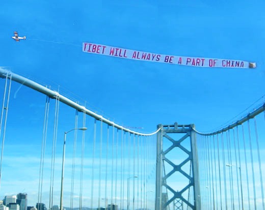 華人華僑還為這次傳遞活動租用了兩架直升飛機,盤旋在沿途的上空。一架飛機上用英文拉出橫幅,“TIBET WILL AIWAYS BE A PART OF CHINA(西藏永遠是中國的一部分)”,另外一個橫幅是:“GO BEIJING CHINA!GO OLYMPICS。g迎到北京看奧運會)”。