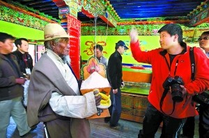 遇到牦牛耕地,外國(guó)記者顯得最感興趣,攝像機(jī)、攝影機(jī)、照相機(jī)左拍右拍。給木訥的藏民提問(wèn),更是他們的熱衷。一位外國(guó)同行問(wèn)一位拉孜縣的中年藏族村民:“你是中國(guó)人,還是西藏人?”