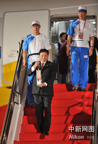 北京奧運(yùn)圣火抵達(dá)三亞,北京奧組委執(zhí)行副主席楊樹(shù)安攜帶火種走下飛機(jī)