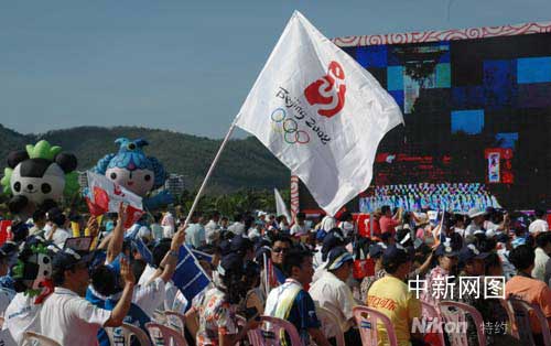 今天的三亞的天空格外晴朗,起跑儀式在鳳凰島“火鳳凰”廣場舉行,取“鳳鳴和諧”之寓意,在圣火傳遞起跑儀式現(xiàn)場,還鑲嵌了本站傳遞208位火炬手的手模。在一個簡短的儀式之后,北京奧組委副主席劉敬民點(diǎn)燃“祥云”火炬,海南省委書記衛(wèi)留成將火炬交給了第一棒火炬手、奧運(yùn)冠軍楊揚(yáng)。