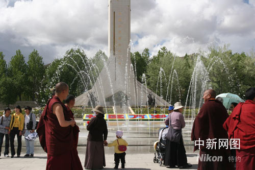 平日只在夜間開放的布達拉宮廣場音樂噴泉,今日破例在白天開放。廣場上用鮮花搭建的“民族大團結(jié)、齊心迎奧運”等三組奧運主題景觀,把不是節(jié)日勝似節(jié)日的廣場裝點得花團錦蔟。廣場上西藏和平解放紀念碑前,幾位紅衣喇嘛正在接受媒體采訪。日前他們曾專門舉辦過“祈愿世界和平、祝福北京奧運”主題法會。年紀稍長的一位喇嘛說!氨本⿰W運會圣火今天成功在珠峰點燃,激發(fā)了中華民族的自豪感。聽說珠峰傳遞結(jié)束后,圣火火種將在拉薩與西藏境內(nèi)傳遞的主火種會合。這又是一次民族團結(jié)的象征,必將彰顯示中華民族傳統(tǒng)的‘和合’理念!