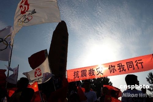 五月十四日,奧運(yùn)圣火傳遞瑞金站舉行起跑儀式,紅軍烈士紀(jì)念塔前人們打出“抗震救災(zāi) 你我同行”標(biāo)語。在當(dāng)日的儀式上會(huì)議主持人倡議以奧運(yùn)圣火傳遞播撒愛心、宣揚(yáng)抗震救災(zāi)。 中新社發(fā) 廖攀 攝