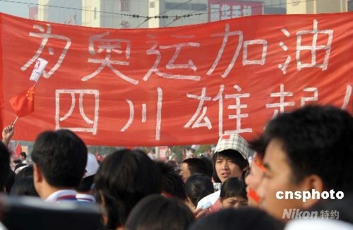 5月16日,奧運(yùn)圣火在江西南昌傳遞,在八一廣場(chǎng)舉行的起跑儀式上,民眾打起“為奧運(yùn)加油 四川雄起”橫幅,為四川地震災(zāi)民鼓勁加油。 中新社發(fā) 廖攀 攝