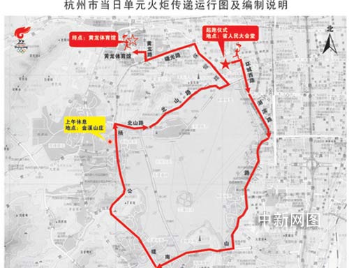 據(jù)悉,杭州段的火炬接力傳遞活動于五月十八日上午八點(diǎn)整將在浙江省人民大會堂東門外廣場舉行起跑儀式,主要環(huán)繞杭州西湖進(jìn)行傳遞,同時(shí)還將經(jīng)過雷鋒夕照、柳浪聞鶯、湖濱路名品街、西湖博覽會博物館等杭州的地標(biāo)建筑和著名景點(diǎn),最后將于十一點(diǎn)半在杭州黃龍?bào)w育館舉行奧運(yùn)火炬接力杭州站結(jié)束儀式,全程預(yù)計(jì)歷時(shí)三小時(shí)四十五分鐘,被定名為“和諧之旅——生活品質(zhì)之路”!