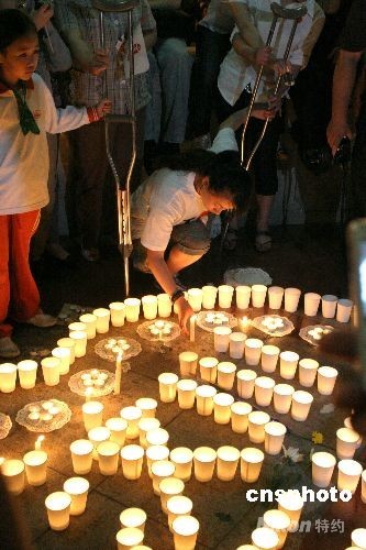 2008年5月21日,全國(guó)哀悼日的第三天,上海市政府對(duì)面的人民廣場(chǎng)上擠滿了對(duì)汶川地震遇難同胞哀悼的人群。在人群中有一位拄著拐杖的女孩,她便是奧運(yùn)火炬手金晶,在周圍人群的攙扶下,她艱難的彎下腰點(diǎn)燃蠟燭并向汶川地震遇難同胞默哀。 中新社發(fā) 俊影 攝