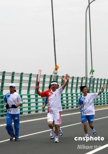 5月22日,奧運(yùn)火炬?zhèn)鬟f寧波站最后一棒火炬手嚴(yán)宏軍,高舉火炬跑過杭州灣跨海大橋。這是全世界跨度最長(zhǎng)的跨海大橋,嚴(yán)宏軍是這座大橋的建設(shè)者之一。 中新社發(fā) 周兆軍 攝