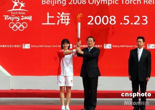 5月23日,北京奧運(yùn)圣火在上海開始傳遞。奧運(yùn)火炬將在上海傳遞2天,共有416名火炬手參加上海段的火炬?zhèn)鬟f活動(dòng),奧運(yùn)游泳冠軍莊泳擔(dān)任首棒。圖為莊泳從中共中央政治局委員,中共上海市委書記俞正聲手中接過奧運(yùn)火炬。 中新社發(fā) 湯彥俊 攝