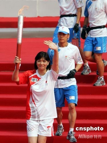 圖:奧運(yùn)冠軍莊泳跑出圣火上海傳遞首棒