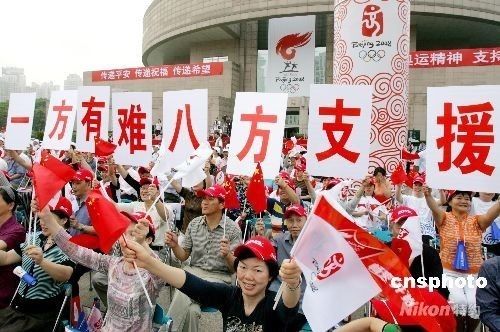 5月23日,北京奧運(yùn)圣火在上海開(kāi)始傳遞。上海市民在喜迎奧運(yùn)圣火的同時(shí),更心系著四川地震災(zāi)區(qū)人民,在火炬?zhèn)鬟f沿途高舉“一方有難,八方支援”、“團(tuán)結(jié)一致,眾志成城”等橫幅,表達(dá)和四川地震災(zāi)區(qū)民眾共度難關(guān)的決心。 中新社發(fā) 湯彥俊 攝