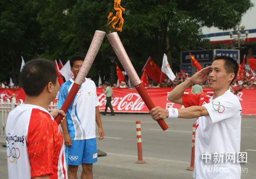 9時(shí)36分,黃勝新接力點(diǎn)燃手中的火炬時(shí),又莊嚴(yán)的行了一個(gè)軍禮,激動(dòng)之情溢于言表!暗诙䝼(gè)軍禮我是向火炬敬的!”黃勝新說(shuō), “盡管祖國(guó)經(jīng)歷了汶川大地震,但是看到奧運(yùn)的圣火在自己的面前順利的傳遞,就相信祖國(guó)一定能戰(zhàn)勝震災(zāi),更相信祖國(guó)有決心、也更有信心把奧運(yùn)會(huì)辦好,為祖國(guó)加油,為奧運(yùn)增彩。”