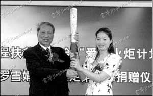昨天上午,蛙泳皇后羅雪娟將北京奧運會第一棒火炬捐贈給中華思源工程扶貧基金會,并正式出任該基金會“愛心火炬計劃”形象大使。