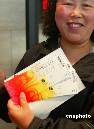資料圖片:5月5日,北京奧運會第三階段門票銷售正式啟動。由于這一階段采取“先到先得”的售票原則,公眾購票熱情十分高漲。據奧運票務中心統計,截至當日上午11時40分,男足半決賽和決賽、男子110米欄半決賽、男籃預賽等8個場次的門票已售罄。第三階段銷售將投放奧運門票138萬張,涵蓋16個大項的244個比賽場次。圖為一位民眾買到票后異常高興。 中新社發(fā) 富田 攝