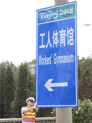 奧運(yùn)專用指路標(biāo)識的施工劃分為三個階段:6月10日至6月17日完成環(huán)路輔路等次要道路的奧運(yùn)專用指路標(biāo)志施工;6月18日至6月25日完成環(huán)路主路等主要道路的奧運(yùn)專用指路標(biāo)志施工;6月25日至6月30日完成全部奧運(yùn)專用指路標(biāo)志施工。