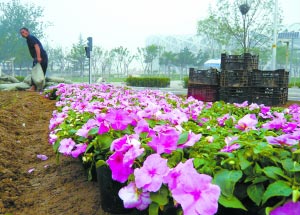 記者上午在鳥巢前看到,滿載著奧運花卉的卡車已經(jīng)陸續(xù)進場,工人們將一袋袋的營養(yǎng)土鋪撒在空地上,一盆盆粉紅色的矮牽牛擁簇在一起,很快就形成了幾個美麗的S形。