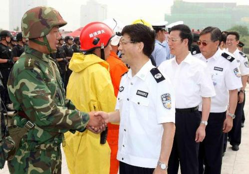 中新網(wǎng)6月25日電 據(jù)中國(guó)公安部網(wǎng)站消息,國(guó)家反恐怖教學(xué)性演習(xí)暨天津“濱海六號(hào)”演習(xí)6月24日起在天津舉行。中共中央政治局委員、天津市委書記張高麗,國(guó)務(wù)委員、公安部黨委書記、部長(zhǎng)孟建柱觀看了 “處置化學(xué)恐怖襲擊事件”的演習(xí)并實(shí)地檢查了奧運(yùn)場(chǎng)館的安全保衛(wèi)工作。