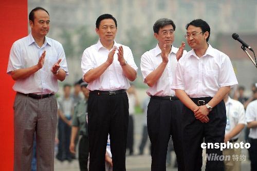 北京奧運(yùn)會(huì)四位新聞發(fā)言人7月8日首次在奧運(yùn)會(huì)主新聞中心啟用儀式上集體亮相。分別是北京奧組委執(zhí)行副主席、秘書長(zhǎng)王偉(左一);國(guó)務(wù)院新聞辦一局局長(zhǎng)郭衛(wèi)民(左二);北京市政府副秘書長(zhǎng)李偉(左三);北京市政府副秘書長(zhǎng)劉志。 中新社發(fā) 陳文 攝