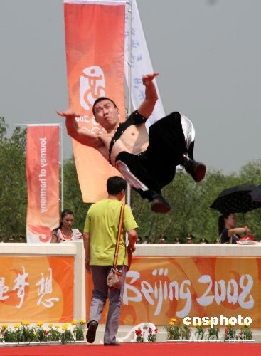 7月11日,北京奧運(yùn)火炬在哈爾濱傳遞,當(dāng)?shù)匚湫g(shù)運(yùn)動(dòng)員在傳遞結(jié)束儀式上激情獻(xiàn)藝。 中新社發(fā) 周兆軍 攝