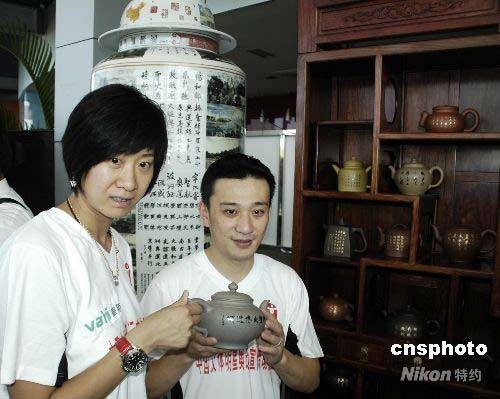 7月12日,“2008奧林匹克文化中國行”在海南三亞開幕。作為全國巡展的首站,三亞的展覽活動(dòng)歷時(shí)兩天,公開展示由226名書畫家共同創(chuàng)作的奧運(yùn)主題大型書畫作品《神州圣火傳遞圖》和《神州圣火傳遞頌》。作品全面描繪了113個(gè)火炬?zhèn)鬟f城市的風(fēng)土人情。活動(dòng)期間還展出奧運(yùn)文化優(yōu)秀作品“中華紫砂壺”和“盛世將軍瓶”。圖為1996年亞特蘭大奧運(yùn)會(huì)游泳冠軍樂靜宜(左)和2000年悉尼奧運(yùn)會(huì)跳水冠軍肖海亮(右),在“中華紫砂壺”和“盛世將軍瓶”前展示“中華紫砂壺”。中新社發(fā) 尹海明 攝