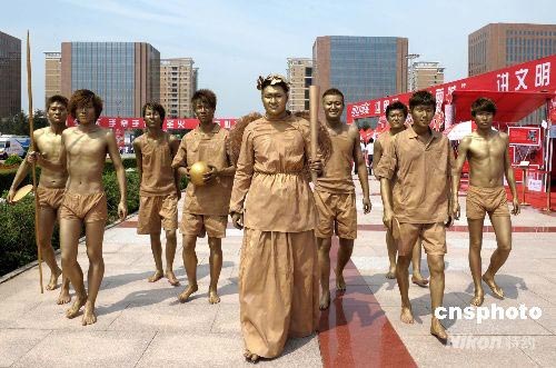7月14日,奧運(yùn)火炬在吉林長(zhǎng)春傳遞。在傳遞終點(diǎn)長(zhǎng)春雕塑公園,青年們裝扮成體育雕塑“傳遞”火炬。 中新社發(fā) 廖攀 攝