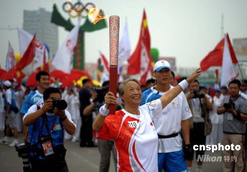 7月15日,出演過《希望的田野》等電影的著名演員柏青在東鎮(zhèn)廣場(chǎng)傳遞完松原最后一棒火炬后,奧運(yùn)火炬在吉林松原的傳遞結(jié)束。 中新社發(fā) 廖攀 攝