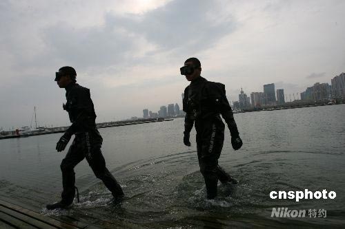 青島邊防支隊駐奧帆中心的特勤官兵暑期在奧運會帆船比賽場地進行適應(yīng)性潛水訓(xùn)練,在貼近實戰(zhàn)狀態(tài)下提高隊員處置突發(fā)事件等能力。第29屆奧運會帆船帆板比賽將于2008年8月9日至23日在青島國際帆船中心及周邊水域舉行。中新社發(fā) 王瑤 攝