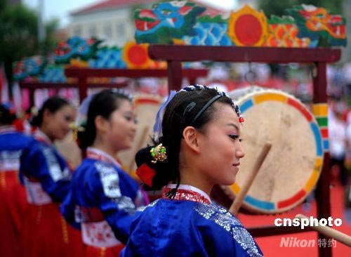 7月15日下午,奧運(yùn)火炬在吉林市傳遞,朝鮮族女鼓樂手擊打鼓樂歡慶火炬?zhèn)鬟f。 中新社發(fā) 廖攀 攝