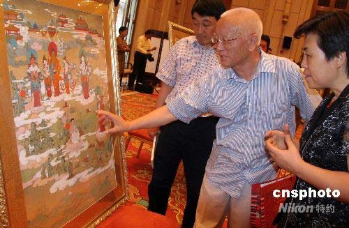 中國(guó)社會(huì)科學(xué)院《格薩爾》研究中心主任、中國(guó)《格薩爾》學(xué)學(xué)會(huì)會(huì)長(zhǎng)降邊嘉措研究員(中)向人們介紹中華民族藏文化藝術(shù)珍品的格薩爾唐卡作品。中新社發(fā) 孫自法 攝