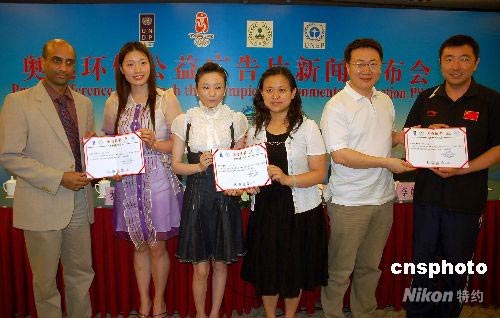 7月15日,在舉世矚目的北京奧運(yùn)會(huì)即將開幕之際,由11位中國奧運(yùn)冠軍傾情出演的“奧運(yùn)環(huán)保公益廣告片”在北京舉行首映式。由中國環(huán)境意識(shí)項(xiàng)目出資拍攝的這部公益廣告片,不僅受到了北京奧組委的鼎力支持,而且得到了王軍霞、鄧亞萍、樓云、高敏、樂靖宜、楊揚(yáng)、楊凌、羅雪娟、桑雪和李永波等奧運(yùn)冠軍和著名教練的熱烈響應(yīng)。圖為羅雪娟(左二)、桑雪(左三)和楊凌(右一)代表其他冠軍接受公益廣告拍攝紀(jì)念證書。中新社發(fā) 潘旭臨 攝