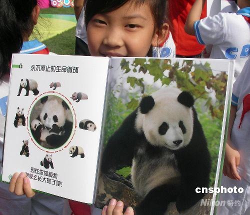 7月16日上午,全球首本由奧運(yùn)大熊貓“晶晶”擔(dān)任主角的科普?qǐng)D書——《我是晶晶-熊貓成長(zhǎng)寫真》中文版在成都大熊貓繁育研究基地舉行了全球首發(fā)儀式。該書歷時(shí)兩年策劃、設(shè)計(jì),由企鵝集團(tuán)著名的多林金德斯利公司著,童趣出版有限公司編譯,人民郵電出版社出版發(fā)行。為表達(dá)對(duì)震后四川、成都的關(guān)愛(ài),該書的全球首發(fā)儀式安排在成都舉行。中新社發(fā) 楊杰 攝