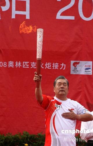 7月17日,北京奧運火炬在沈陽傳遞,第一棒火炬手是“中國奧運第一人”劉長春的次子劉鴻圖。三個月前,他的哥哥劉鴻亮參加了北京奧運火炬在希臘的傳遞活動。劉鴻圖接過第一棒火炬后,手撫胸口閉目默念。他在接受記者采訪時說,他用這種方式告慰先父,由他開啟的中國人的百年奧運夢想終于實現了。中新社發(fā) 周兆軍 攝