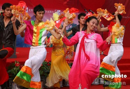 北京奧運(yùn)火炬在遼寧鞍山傳遞,當(dāng)?shù)厝罕娸d歌載舞喜迎奧運(yùn)火炬。 中新社發(fā) 周兆軍 攝