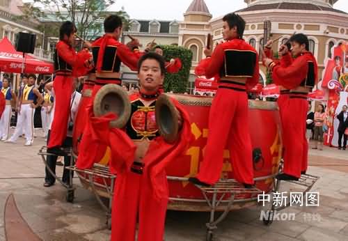 7月19日,北京奧運(yùn)火炬在大連傳遞,當(dāng)?shù)孛癖娗庙懲L(fēng)鑼鼓激情迎接奧運(yùn)火炬。記者周兆軍攝