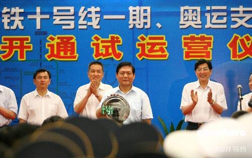 7月19日,北京地鐵10號(hào)線(一期)、奧運(yùn)支線、機(jī)場(chǎng)線開通試運(yùn)營(yíng)儀式在地鐵10號(hào)線與奧運(yùn)支線交匯的北土城站舉行。中共中央政治局委員、北京市委書記、北京奧組委主席劉淇啟動(dòng)三條地鐵線路。 中新社發(fā) 富田 攝