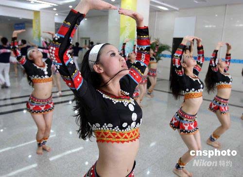 七月二十日,北京奧運(yùn)會(huì)、殘奧會(huì)體育展示與頒獎(jiǎng)儀式誓師動(dòng)員大會(huì)在理工大學(xué)舉行。圖為演出前,參加演出的演員進(jìn)行緊張排練。中新社發(fā) 任海霞 攝