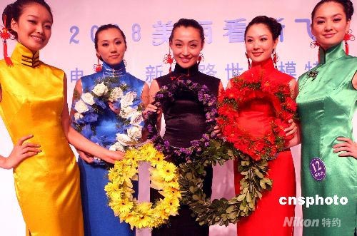 7月20日,2008美麗看新飛--新絲路世界模特大賽中國區(qū)總決賽在遼寧大連啤酒節(jié)上舉行,是次賽事經(jīng)過在中國5大城市巡演后的最后一站。15名中國賽區(qū)職業(yè)選手參加了5大城市巡演選拔,最后角逐出了10名最佳模特參加10月在北京舉行的新絲路世界模特大賽國際總決賽。圖為參賽模特選手身穿五色旗袍展示五環(huán)奧運風(fēng)采。 中新社發(fā) 錢興強 攝