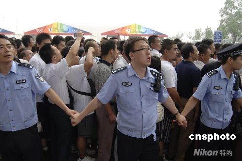 7月25日上午9時(shí),第4階段奧運(yùn)門票銷售正式開始,近百名奧運(yùn)安保人員在北京五棵松籃球體育館外現(xiàn)場(chǎng)指揮數(shù)千球迷有序購(gòu)票。中新社發(fā) 徐曦弋 攝