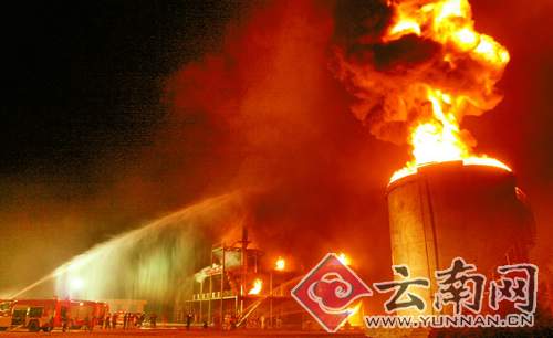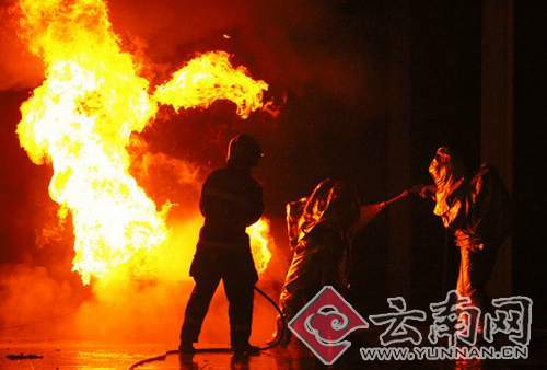 現(xiàn)場指揮部立即調(diào)動昆明、普洱、保山、西雙版納、麗江5地特勤部隊5輛戰(zhàn)斗車31名特勤隊員,對化工廠職工宿舍火災(zāi)進行撲救。伴隨著呼嘯的警笛聲,消防照明車豎起照明燈,將起火的職工宿舍照的如同白晝。