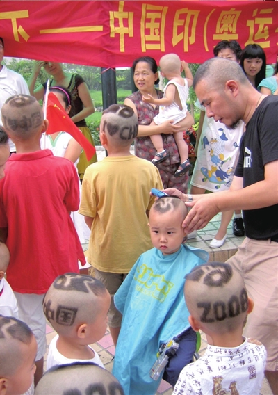昨天,吳大勝(右一)正在一名小朋友頭上“創(chuàng)作”。北京市民吳大勝這幾天忙著免費為小區(qū)的孩子理“奧運頭”,以迎接第29屆奧運會。他在孩子們的頭上理出多種圖案,受到歡迎!