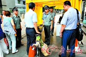 在拉上警戒線的同時,警戒線內(nèi)的人行道上同時也增設(shè)了固定的保安執(zhí)勤哨,記者看到,在短短不到20米的距離就有3名保安負責執(zhí)勤。“我是從北京郵電大學保安隊調(diào)過來的,”一名正在執(zhí)勤的保安透露,“據(jù)我所知,這里是從7月7日開始上保安的,7月15日又從北京各保安大隊調(diào)來一批保安,7月20日來北師大執(zhí)行任務的所有保安才真正調(diào)齊。”他說,除了北師大原有的保安人員外,從其他地方調(diào)來的保安就達到400多人,“我們在外面執(zhí)勤一般是3小時換一崗,每個人每天值兩班。”