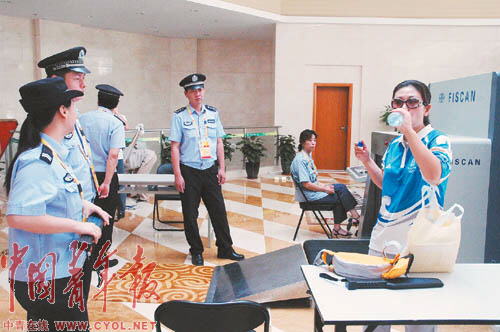 由于目前上海體育場(chǎng)實(shí)施全封閉管理,必須憑有效證件才能進(jìn)入封閉區(qū)域,記者佩戴著奧運(yùn)會(huì)注冊(cè)記者證進(jìn)入上海體育場(chǎng)。在工作人員的安檢通道:首先,要在專門的驗(yàn)證機(jī)器上檢查證件的真實(shí)性;接著,從兩根黑色柱子中間穿過,而這兩根很不起眼的黑色柱子卻是非常厲害的核生化檢測(cè)儀器,任何一點(diǎn)放射性物質(zhì)都可以檢測(cè)出來;隨后,就會(huì)通過和機(jī)場(chǎng)相同的安檢門,如果身上攜帶了金屬物品,儀器就會(huì)發(fā)出警報(bào),工作人員就會(huì)手持安全檢查儀進(jìn)行進(jìn)一步檢查,而行李則須從X光物品檢查儀通過。而更嚴(yán)格的是,進(jìn)入奧運(yùn)場(chǎng)所的人員攜帶的手機(jī)、手提電腦都必須進(jìn)行開機(jī)測(cè)試,攜帶的飲料則必須開瓶試飲一口,至于打火機(jī)則不得帶入。