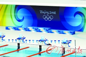 還有10天,2008年北京奧運(yùn)會(huì)即將開幕,如今每個(gè)人、每個(gè)場館都進(jìn)入了最后的備戰(zhàn)狀態(tài),尤其是比賽場館基本都處于封閉狀態(tài)。今天,借著難得的中、日花樣游泳公開訓(xùn)練機(jī)會(huì)記者有幸再次走進(jìn)國家游泳館——“水立方”。由于中、日兩隊(duì)臨時(shí)改變訓(xùn)練場,這倒讓記者得以好好領(lǐng)略了一下現(xiàn)在的“水立方”內(nèi)部。跳水臺后面黃色的“祥云”背景、游泳池旁的領(lǐng)獎(jiǎng)臺以及幾個(gè)巨大的觀賽顯示屏,加上記者席上的液晶顯示器,記者發(fā)現(xiàn),與年初的國際泳聯(lián)跳水世界杯時(shí)相比,這里變了很多!艾F(xiàn)在我們真正可以說隨時(shí)等著比賽了!薄八⒎健钡目磁_席主管程秀麗信心十足地表示。