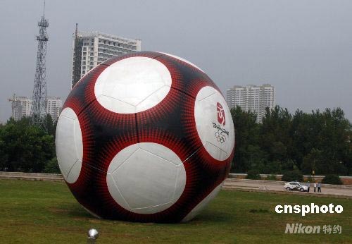 7月30日,秦皇島市區(qū)內(nèi)巨大的足球雕塑。當(dāng)日,奧運火炬在河北省秦皇島市進行傳遞。秦皇島是北京奧運會足球比賽分賽場之一。 中新社發(fā) 廖攀 攝